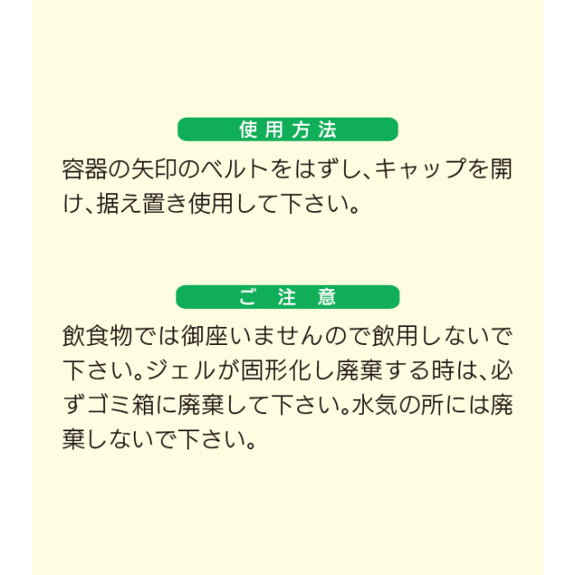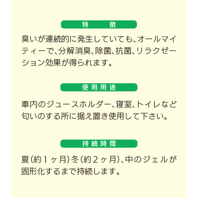 ■持続期間:中のジェルが固形化するまで持続(目安:夏は約1ヶ月、冬は約2ヶ月)